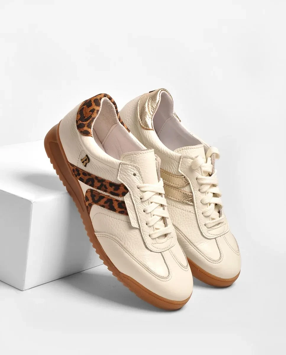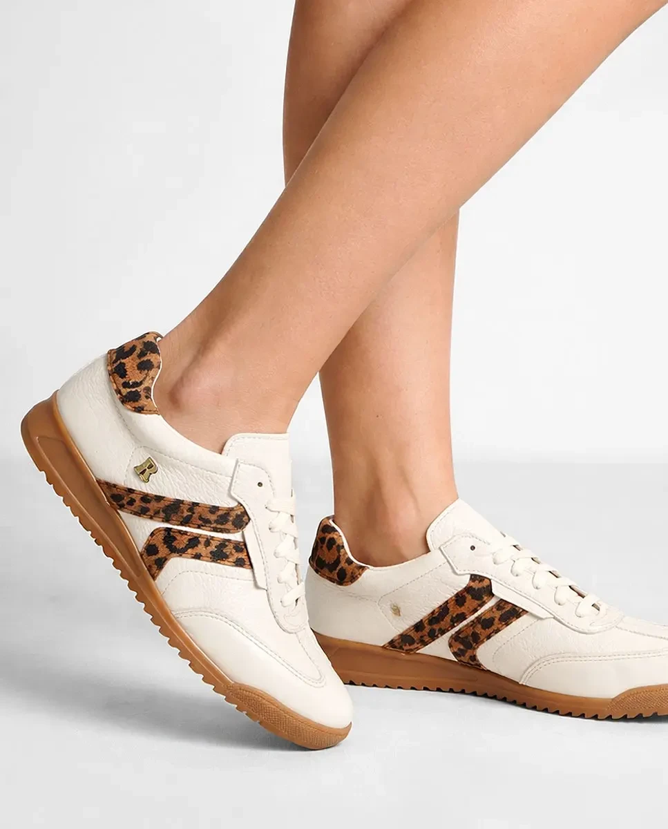 Ténis em pele com detalhes de leopardo em camurça.