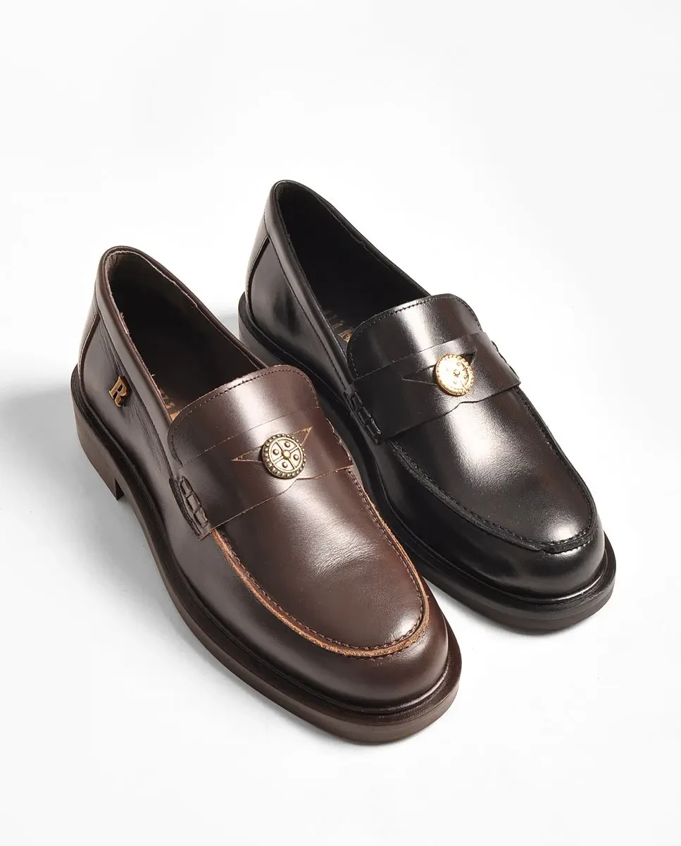 Sapato em pele, cor castanho.